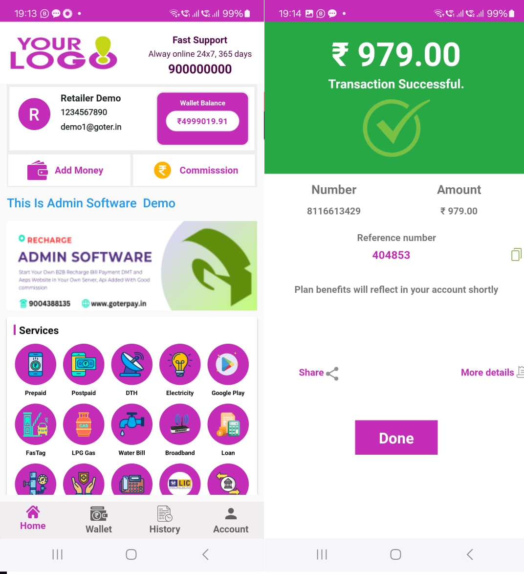 Prepaid,PostPaid, DTH Recharge, Bill Pay - BroadBand, ElectriCity, FASTag, Gas, Insurance, LandLine, Loan Emi, LPG, Booking, Water